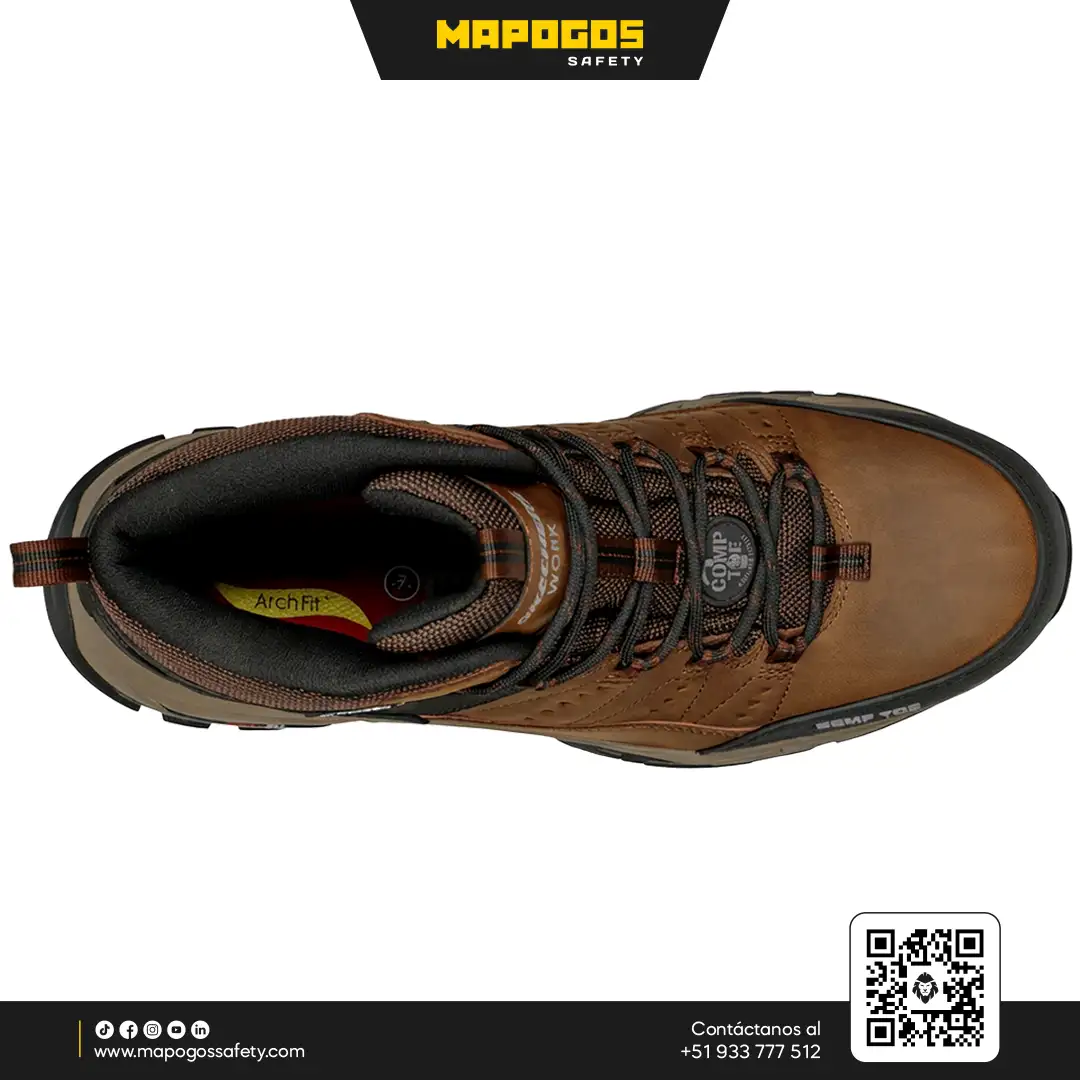 Este calzado de seguridad está construido en cuero de alta resistencia con tecnología Waterproof y sistema de soporte Arch Fit® certificado por podólogos. Incorpora una puntera de seguridad compuesta (Composite Toe) no metálica y una suela de tracción superior que optimiza la estabilidad en superficies irregulares.