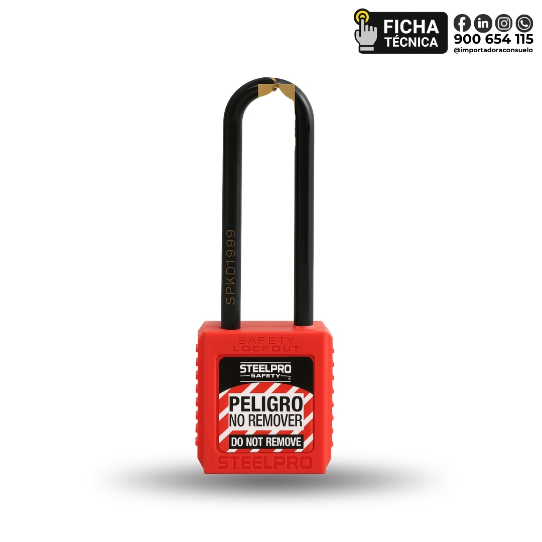 Cuenta con un grillete largo que permite asegurar puntos de difícil acceso o múltiples dispositivos. El color rojo facilita la identificación visual y ayuda a cumplir con protocolos de seguridad por colores.