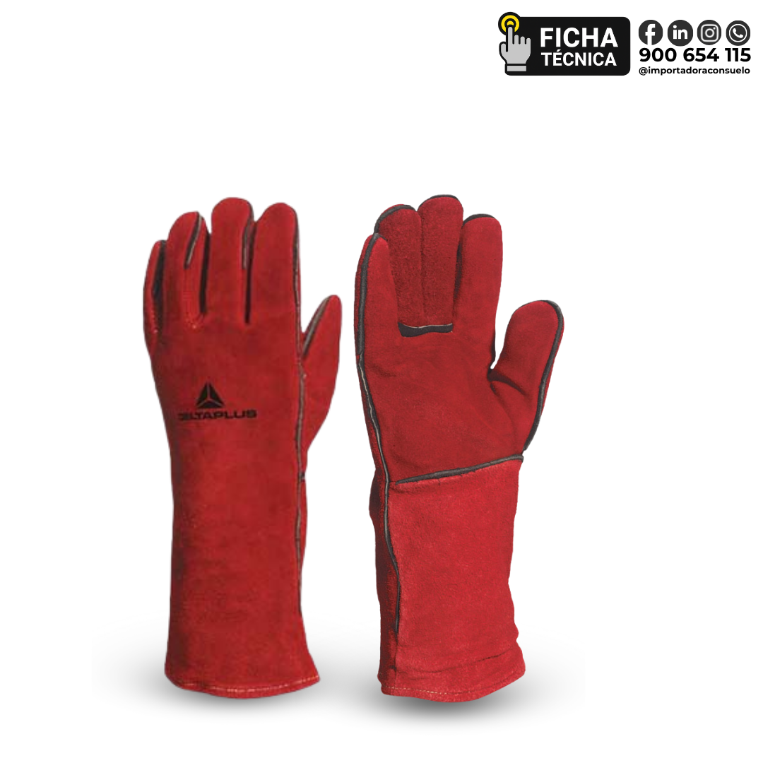 Guante de soldador largo tipo americano, en piel serraje de vacuno (1,2–1,4 mm), con forro interno de muletón, costuras en hilo Kevlar®, y puño de cuero, que ofrece protección térmica, mecánica y contra salpicaduras de metal.