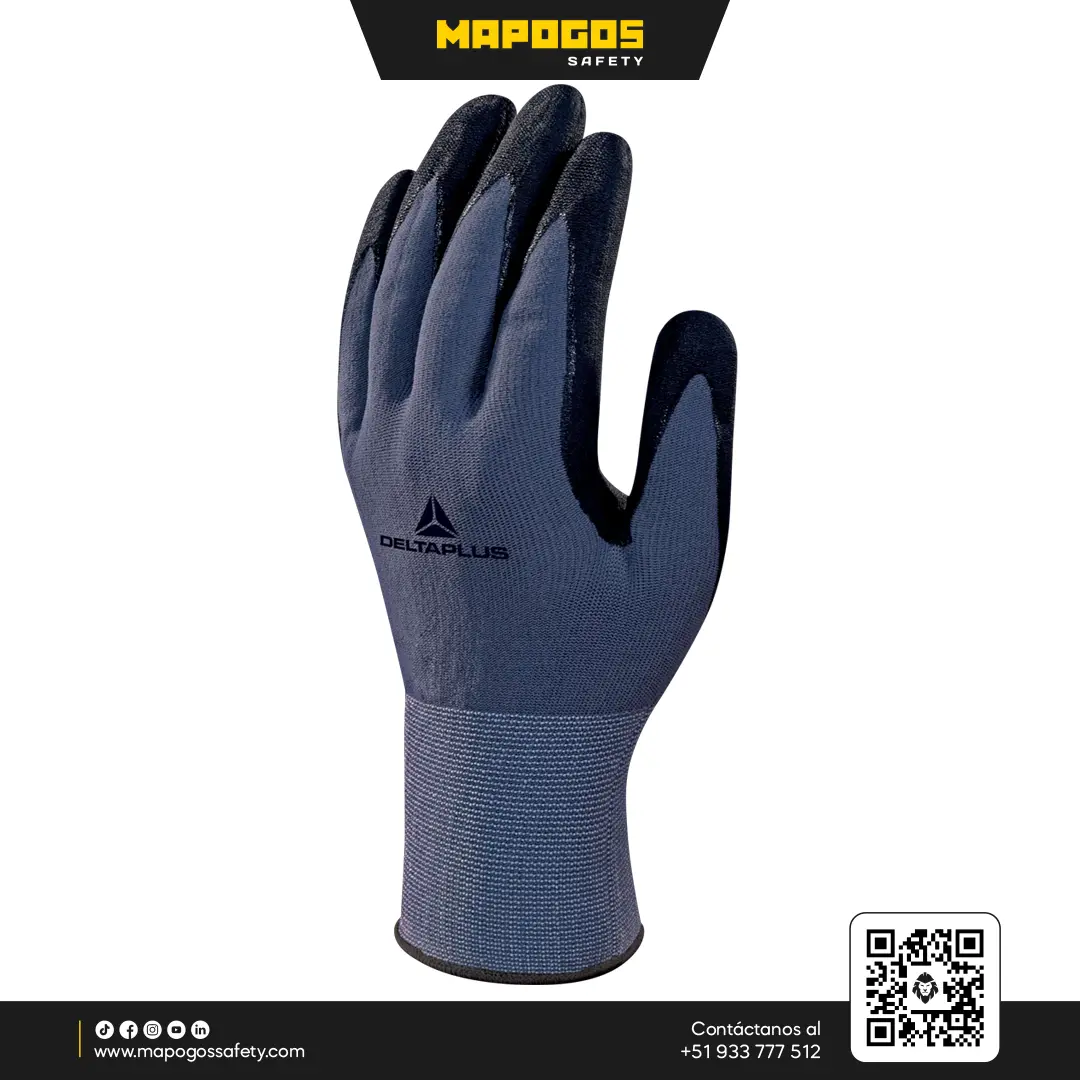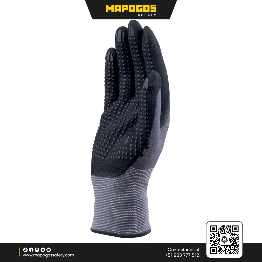 Guante de alta tecnología en poliamida/spandex con recubrimiento de polímero y tacos de nitrilo. Ofrece máxima precisión y agarre superior en superficies grasas.