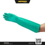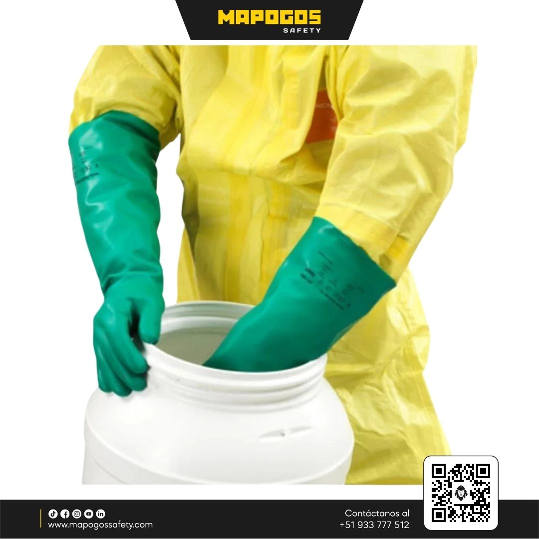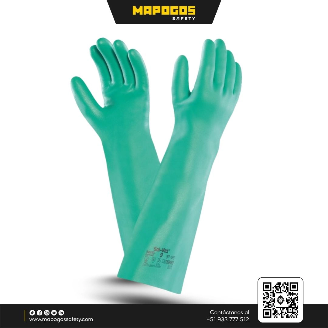 Los guantes Solvex de nitrilo verde de 18 pulgadas están diseñados para brindar protección superior contra productos químicos agresivos, solventes, aceites y grasas, con una cobertura extendida hasta el antebrazo superior, ideal para entornos donde el contacto con líquidos es constante.