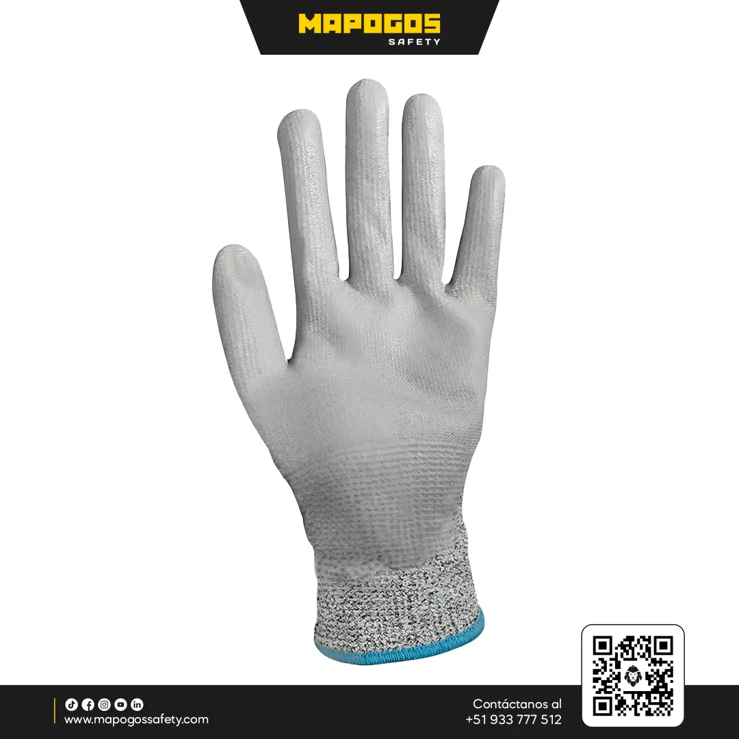 Guante de seguridad anticorte fabricado en HPPE y fibra de vidrio con palma de PU. Diseñado para trabajos de montaje que requieren máxima destreza y protección contra filos.