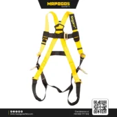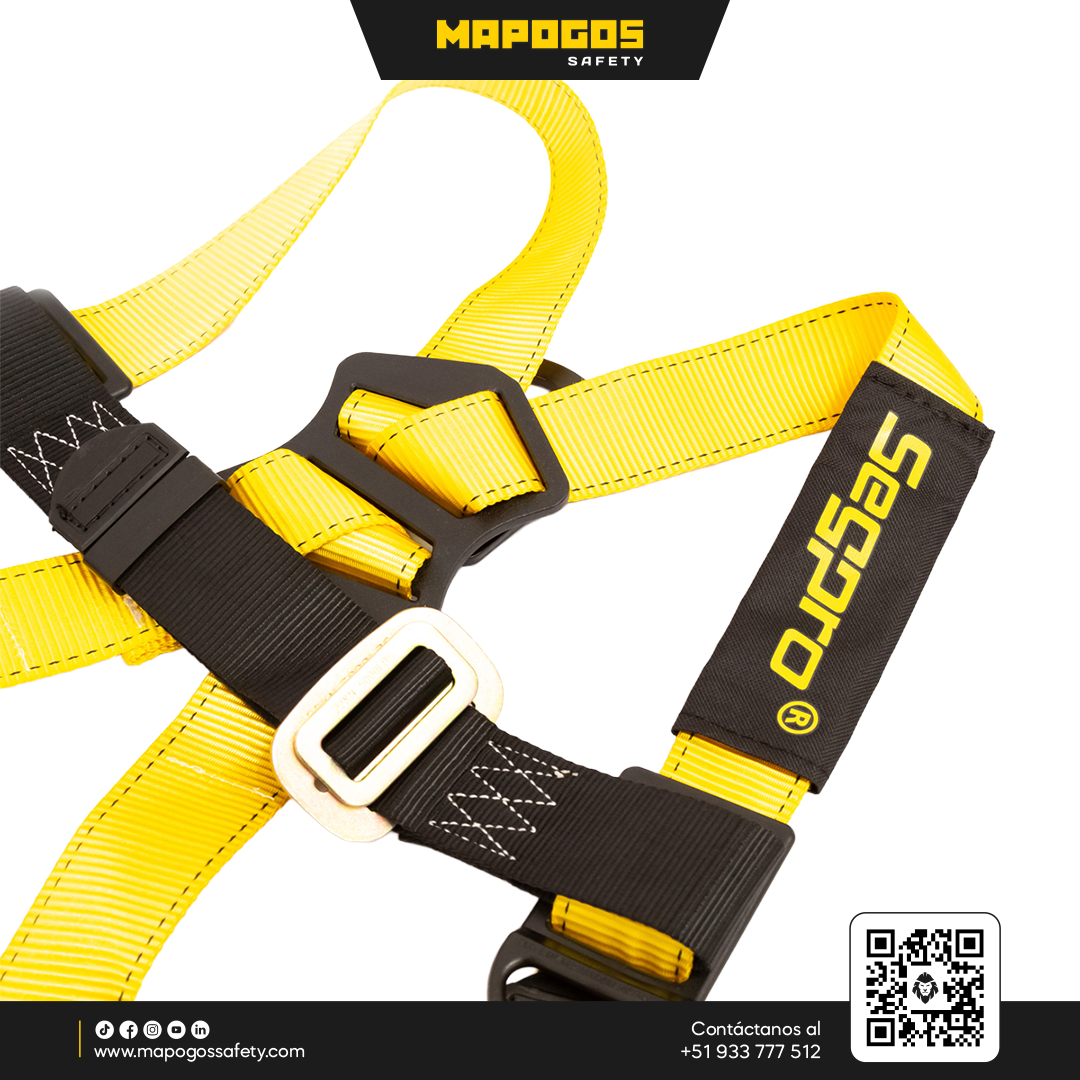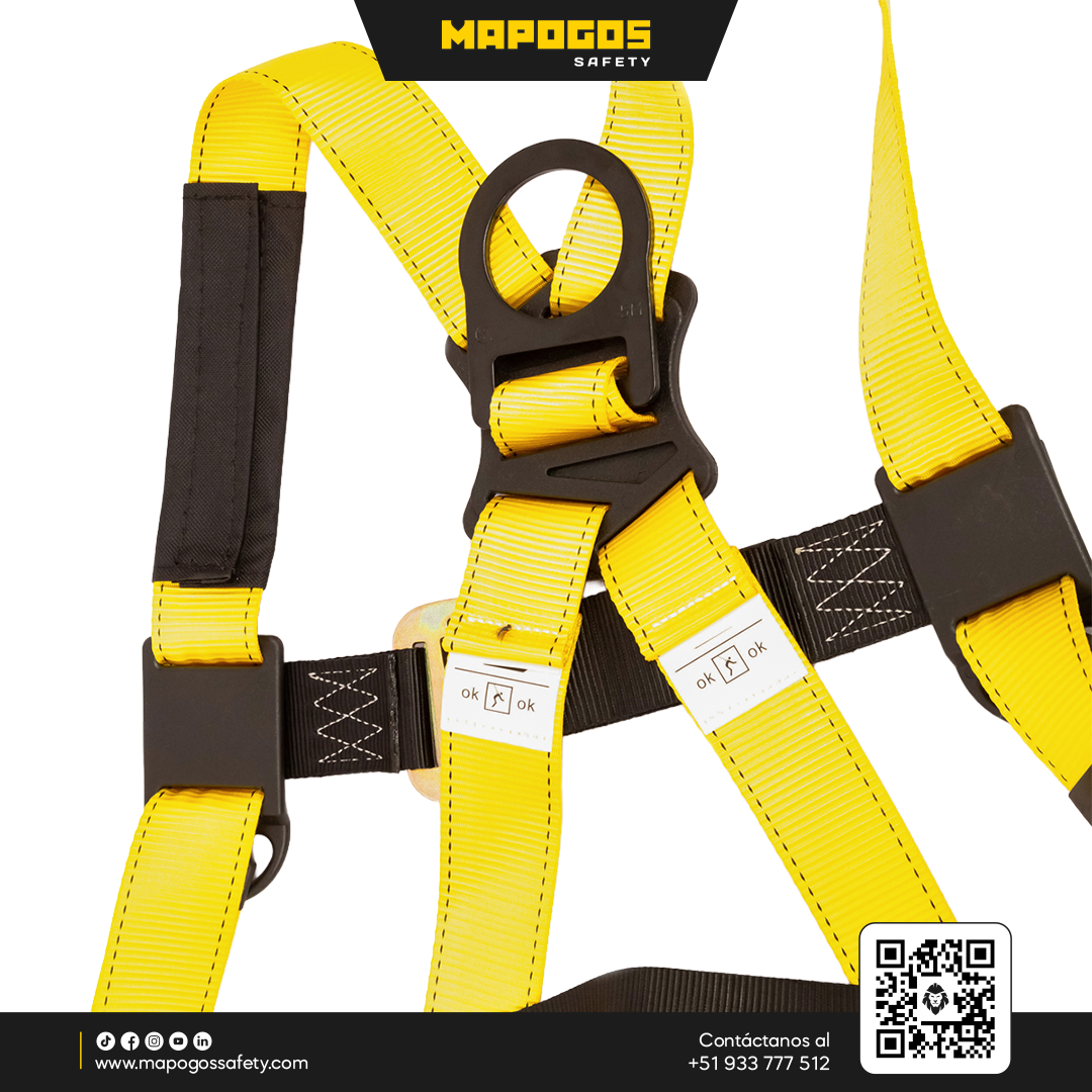 Nuestro arnés de cuerpo completo cuenta con tres anillos metálicos: uno en la espalda para riesgos de caída y dos en la cintura para trabajos de posicionamiento, además de correas ajustables para un mayor confort.