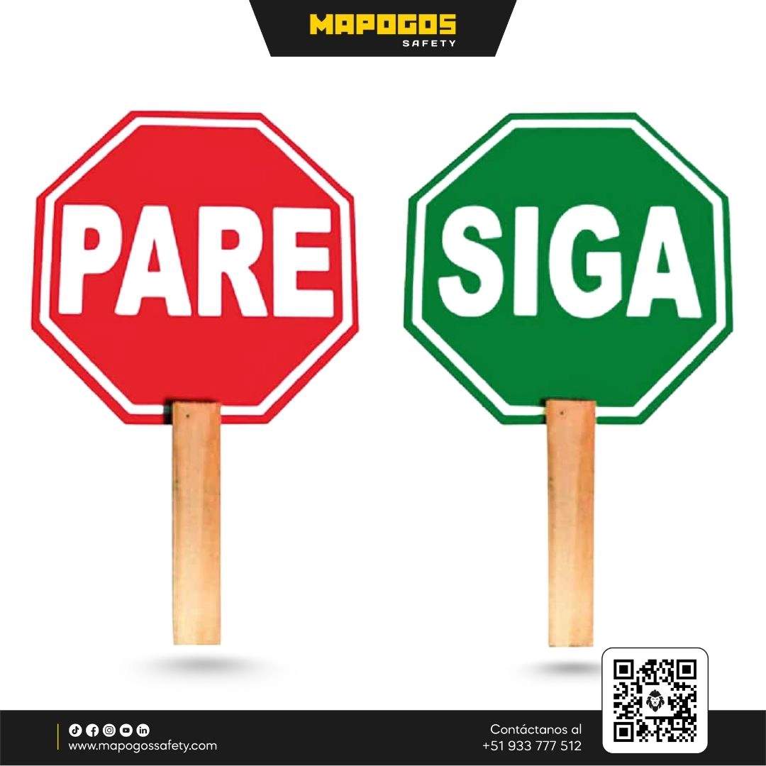Paleta manual de madera con doble cara “PARE” y “SIGA” en PVC reflectivo. Mango ergonómico, fácil de operar y ligera. Ideal para controlar tráfico en obras, eventos o emergencias, con alta visibilidad y resistencia.