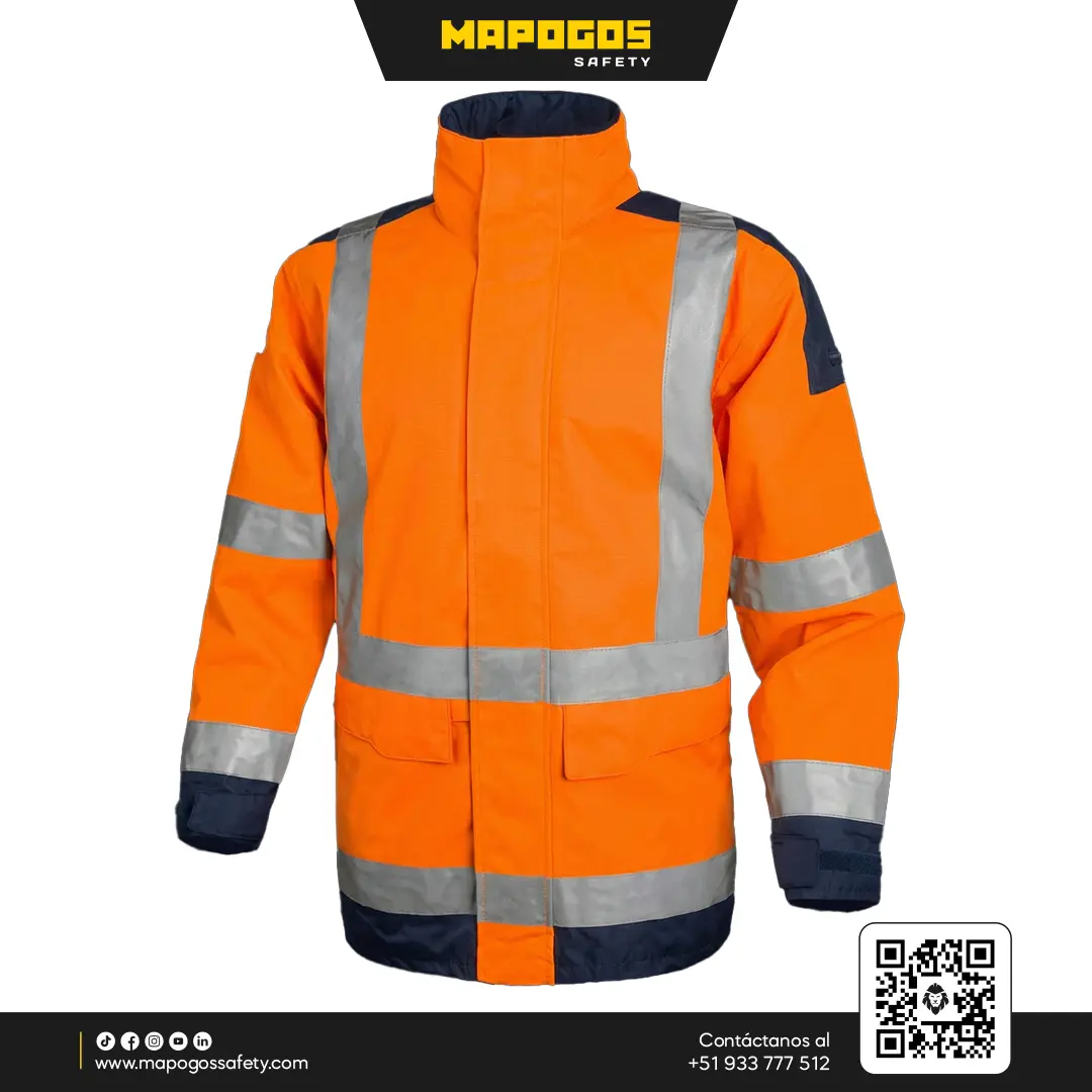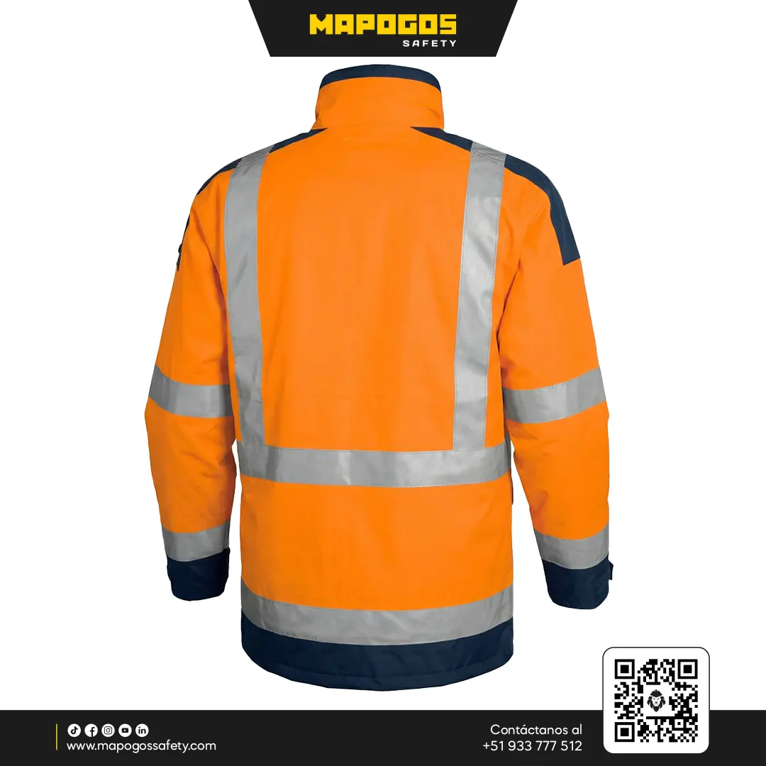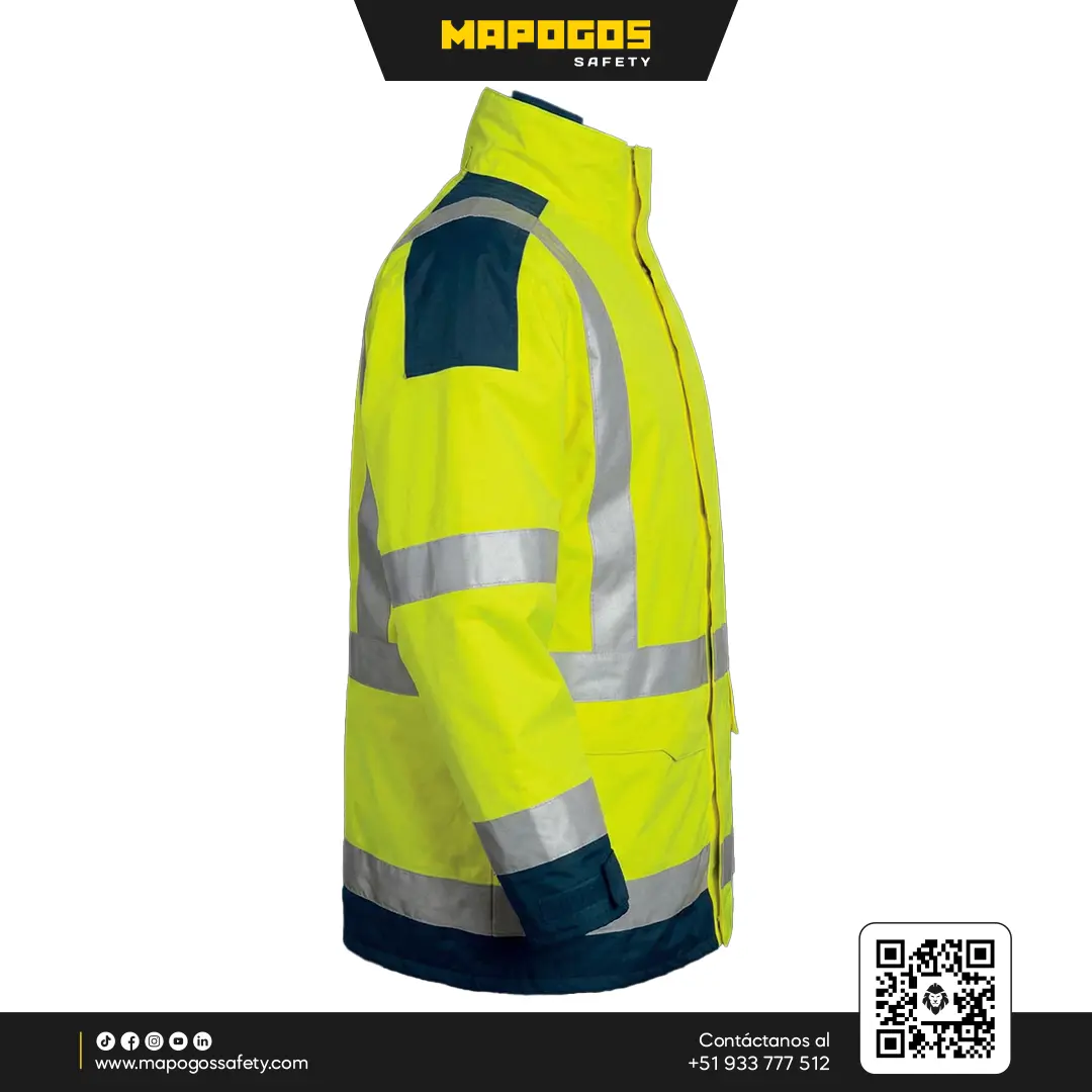 Parka impermeable de alta visibilidad diseñada para resistir condiciones climáticas adversas y entornos industriales exigentes. Combina calidez, resistencia a la abrasión y cumplimiento normativo para seguridad 24/7.