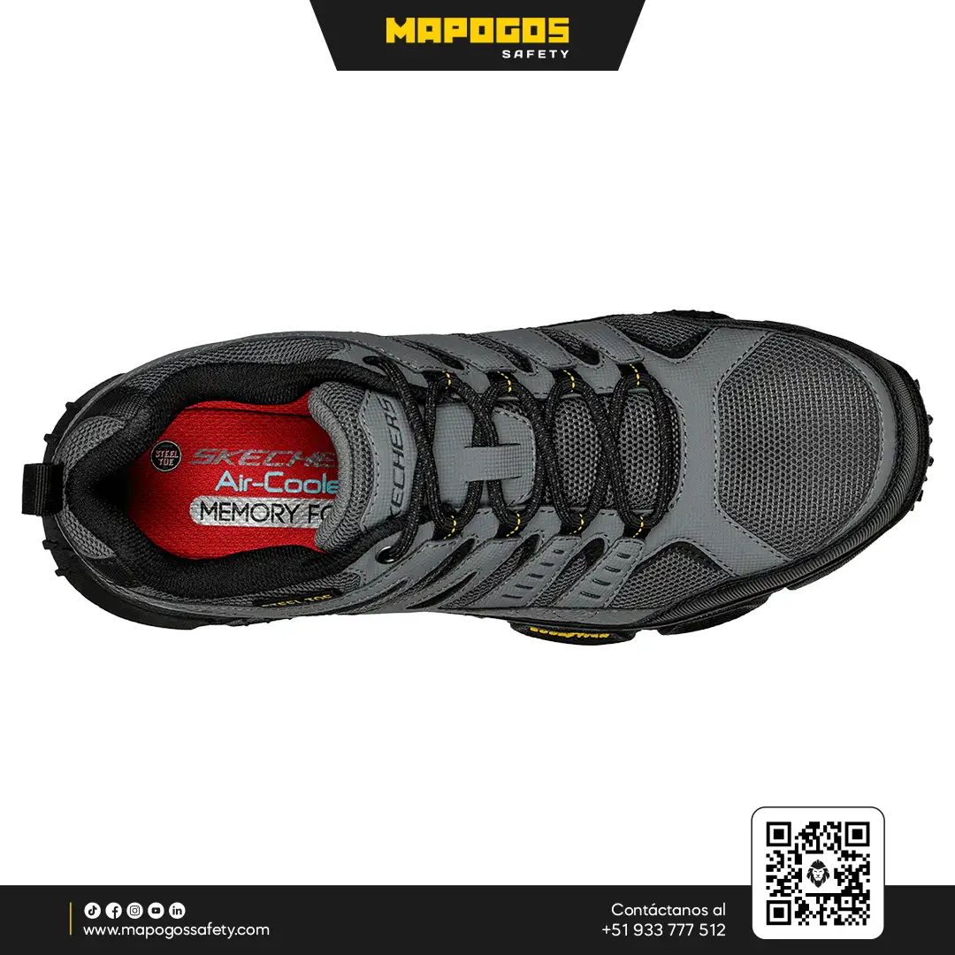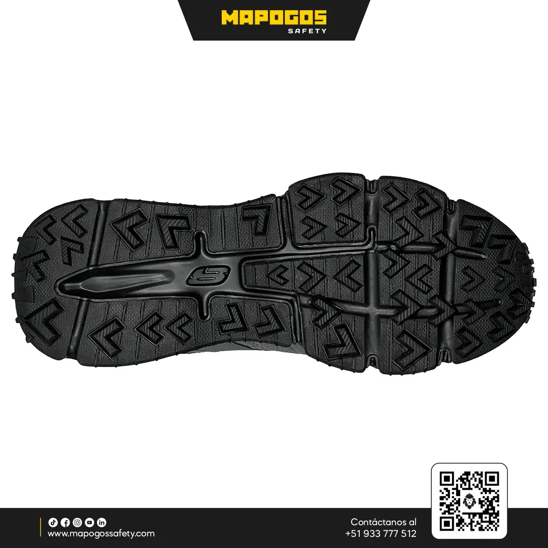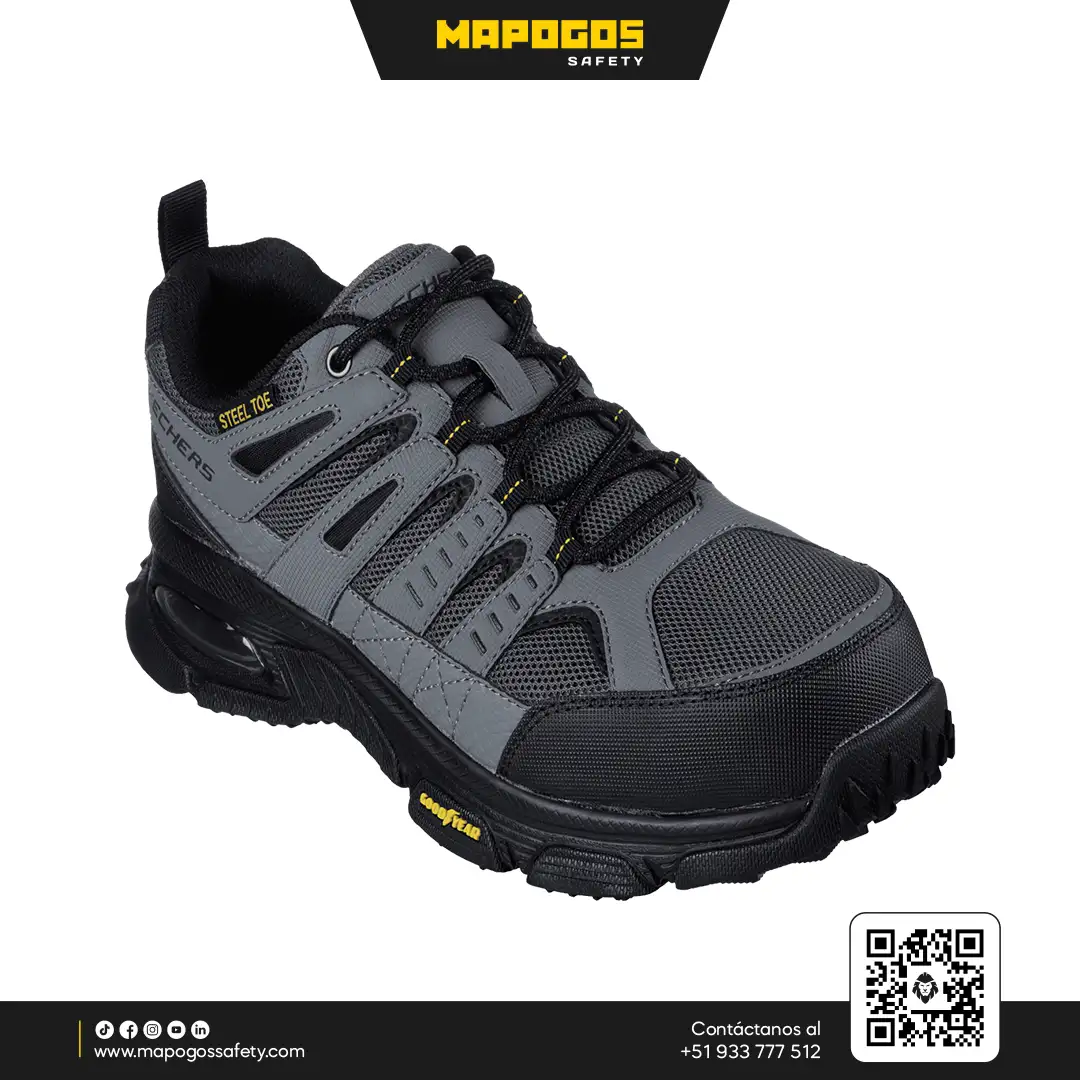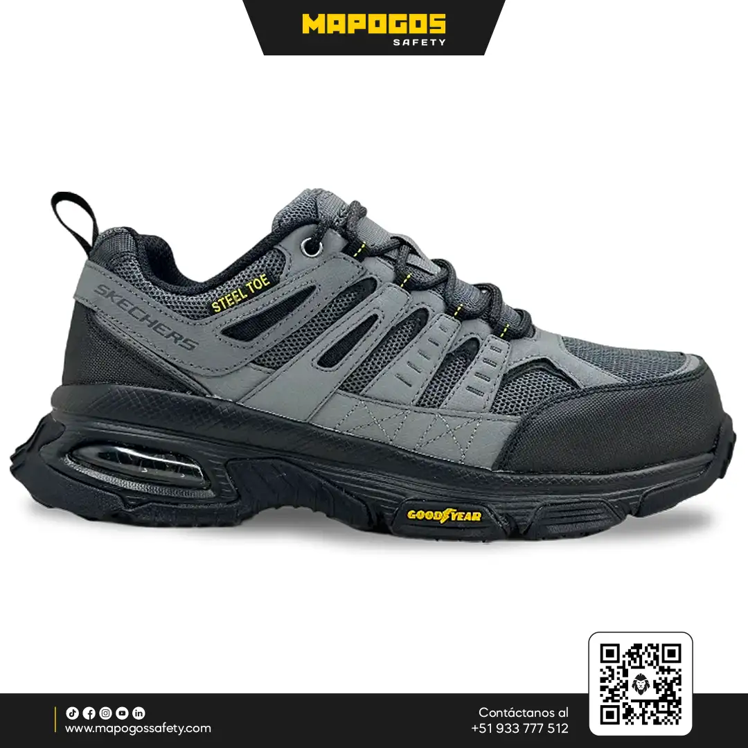 Esta zapatilla de seguridad de perfil atlético combina una capellada de cuero suave y malla técnica tratada con 3M Scotchgard® para repeler líquidos y manchas. Integra una entresuela con cámara de aire visible Skech-Air® y una suela de caucho de alto rendimiento Goodyear®, ofreciendo durabilidad extrema con un peso optimizado.