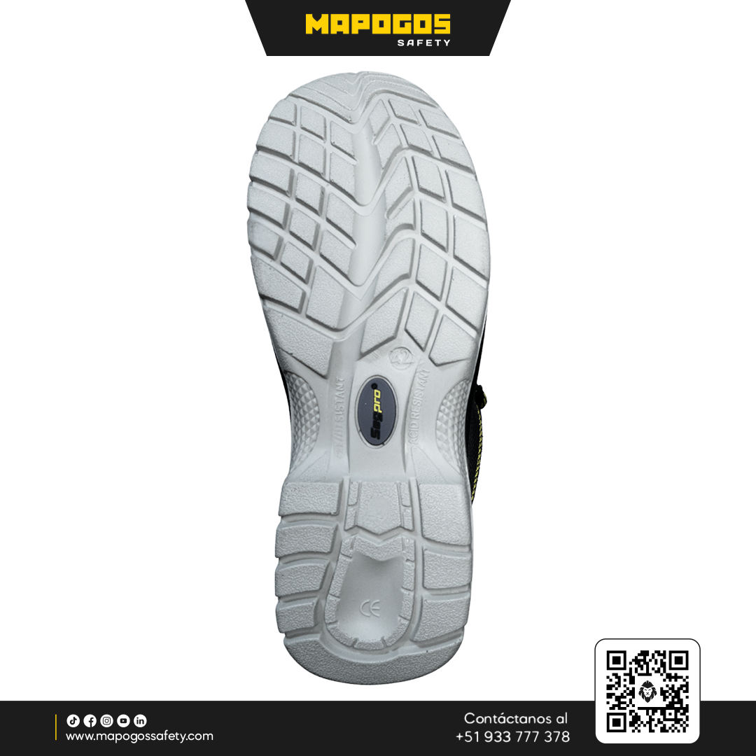 - Suela PU bi-densidad antideslizante y resistente a químicos/aceites.